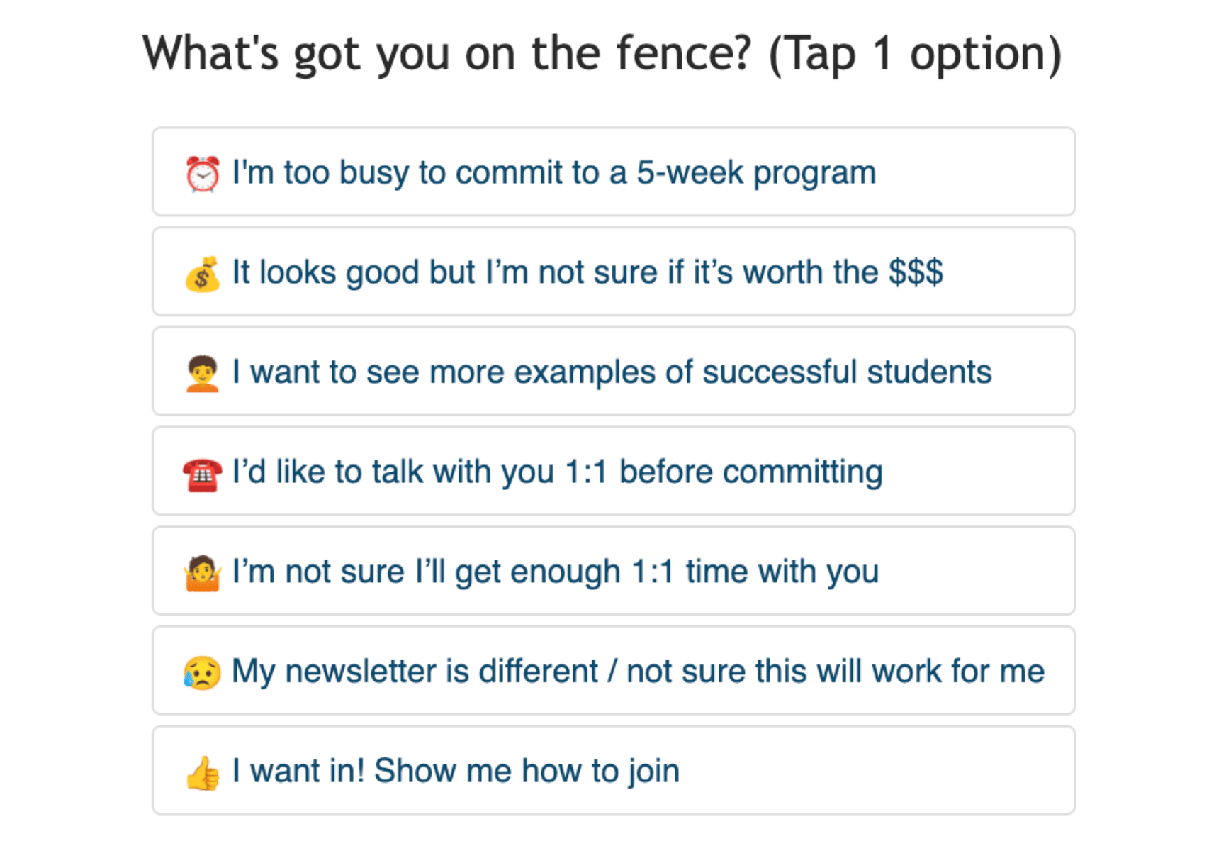 In the poll, he never mentioned price as the objection. It signals two things: You’re confident about the value. You don’t want to attract publications that don’t look at $2499 as simple investments.